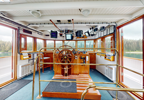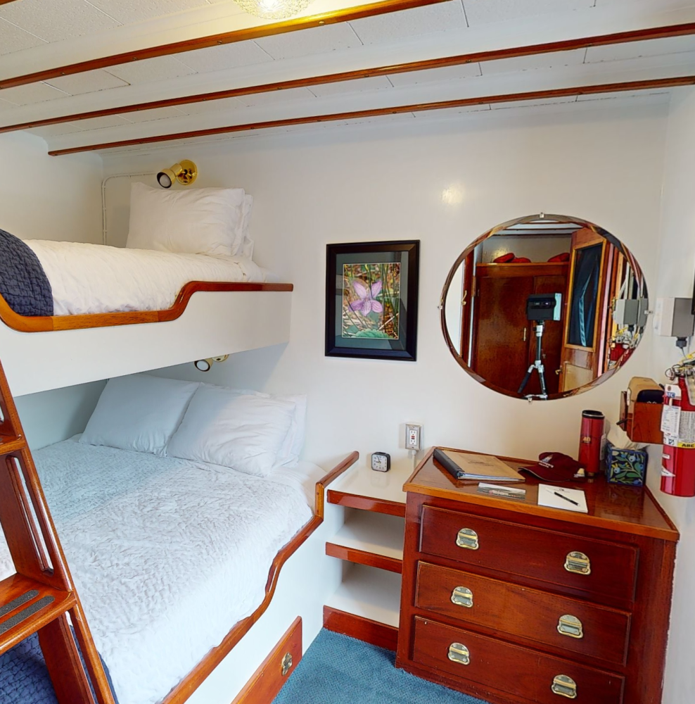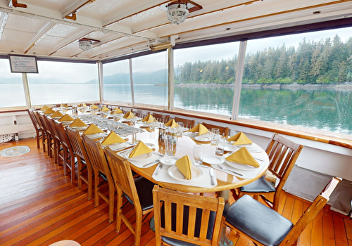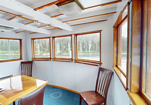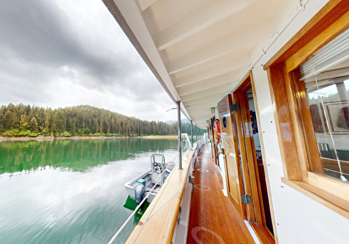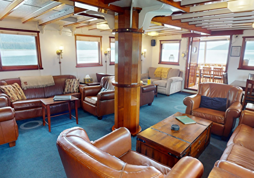 Liseron is 145 feet long, 28 feet wide with a draft of 8.5 feet. Her sister ship, the M/V Mist Cove was built as a near identical duplicate paying homage to Liseron’s beauty and legacy. Liseron is proudly American built and flagged and features: Staterooms: 10 staterooms (6 on main deck, 4 on upper deck) 6 staterooms on main deck with queen-sized bed plus upper twin bunk 4 staterooms on upper deck with queen-sized bed plus upper twin bunk Main Features: Accommodates 20 passengers Comfortable main salon (common room) Entertainment center with music, TV and a selection of movies. Bluetooth available Open bar (wine, beer, premium liquors & non-alcoholic drinks) Library and games Eisenglass-enclosed heated fantail used for dining or relaxing Clothes drying locker Enclosed forward observation lounge on the upper deck Service features: A crew of 12 to serve all of your needs All meals and snacks prepared fresh by our onboard chef Breakfast, lunch, dinner and all snacks included We are delighted to feature your catch, when available. Activities: Hiking, nature walks, beach combing Kayaking Stream, lake and shore fishing, and trolling from 20′ skiffs Wildlife viewing (binoculars in every room) Trained naturalist guides Entertaining and educational presentations